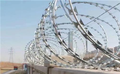 (1)刺繩滾籠安裝在隔離網頂端,與柱頂平齊,刺網不出現擰轉情況。安裝時采用專用刺繩連接卡與中間立柱頂端兩側的弧形槍尖進行固定,滾籠水平應兩道鍍鋅拉絲進行加固,以保證滾籠穩定可靠。