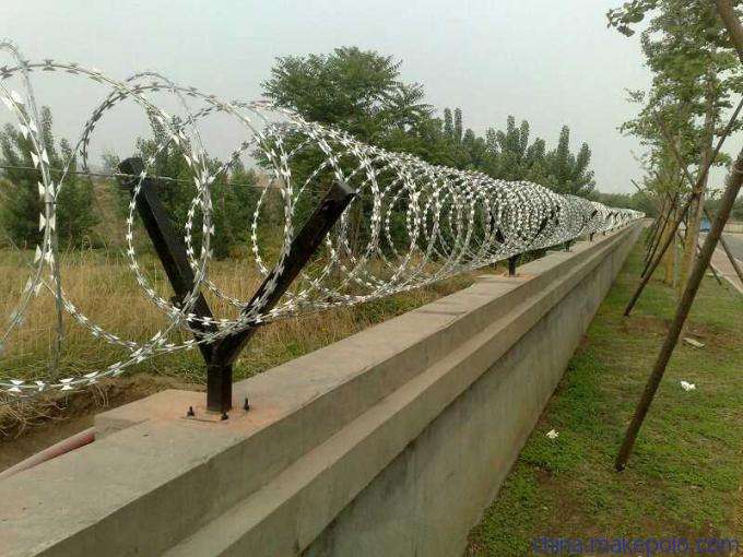 (4)支架在圍墻上的固定方法一般為底盤打膨脹螺絲固定。固定好后,方可進行蛇腹型刀刺網安裝。